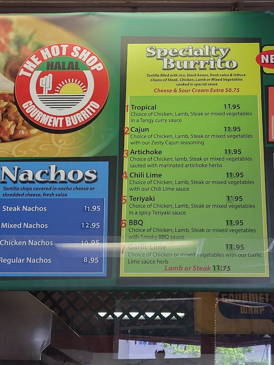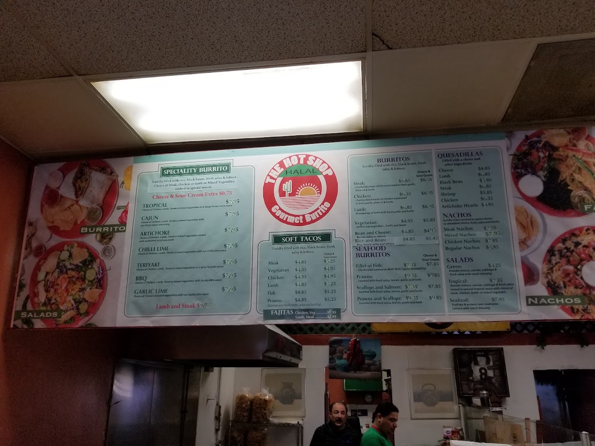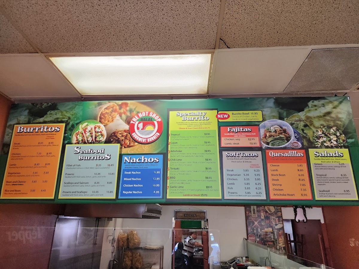 The menu at Hot Shop offers a distinctive fusion of Afghan and Mexican cuisine, focusing on a variety of burritos and Mexican-style snacks. Visitors can expect a range of specialty burritos featuring different sauces and ingredients, including options such as Teriyaki, Artichoke, Tropical, BBQ, Chili Lime, and Garlic Lime. Notable highlight items include the Cajun Burrito, Steak Burrito - Tropical, Steak Tropical Burrito Supreme, Shrimp Burrito, and Artichoke Burrito.