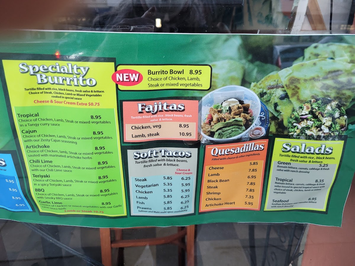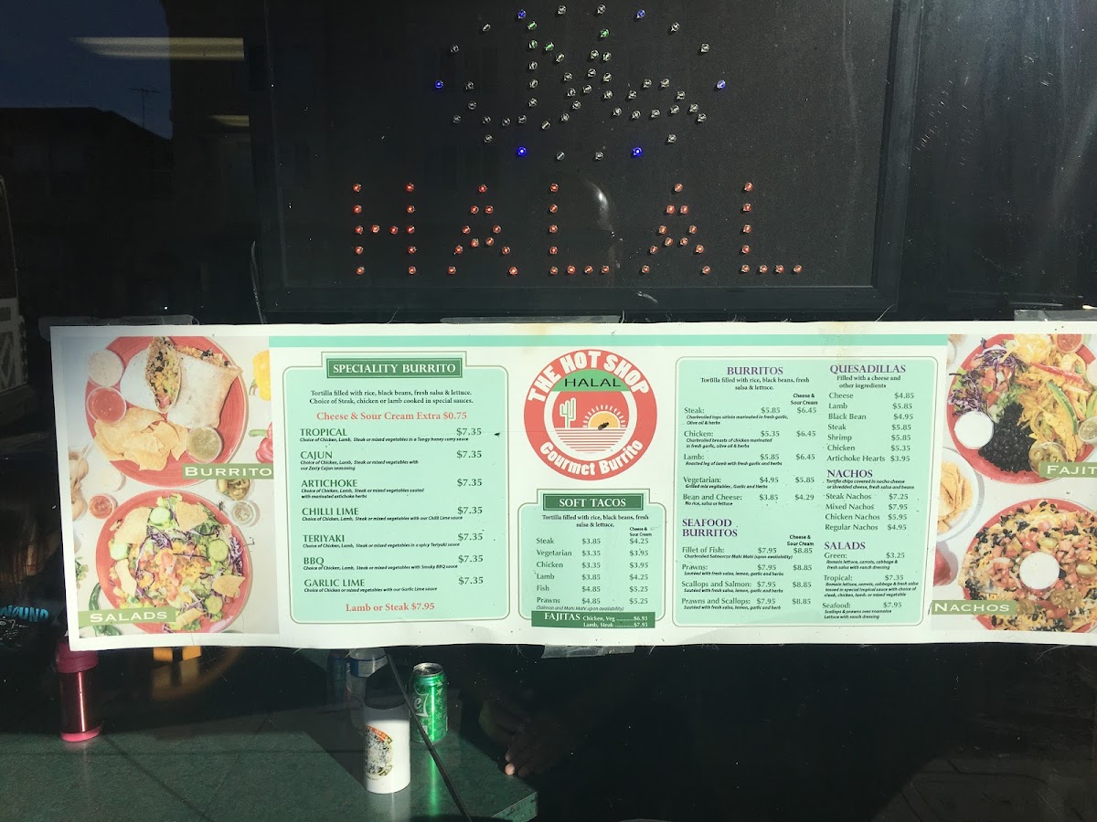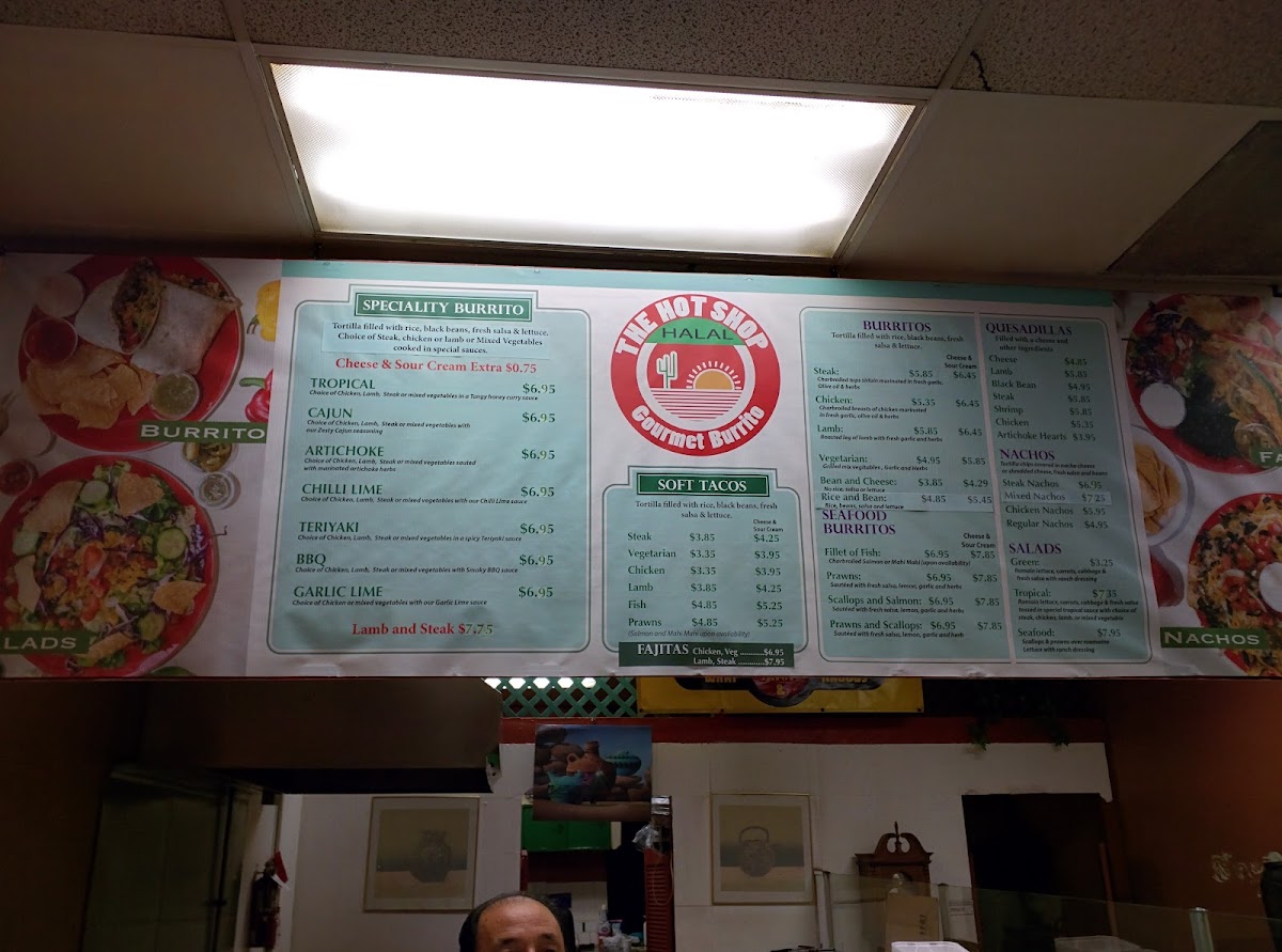 The menu at Hot Shop offers a distinctive fusion of Afghan and Mexican cuisine, focusing on a variety of burritos and Mexican-style snacks. Visitors can expect a range of specialty burritos featuring different sauces and ingredients, including options such as Teriyaki, Artichoke, Tropical, BBQ, Chili Lime, and Garlic Lime. Notable highlight items include the Cajun Burrito, Steak Burrito - Tropical, Steak Tropical Burrito Supreme, Shrimp Burrito, and Artichoke Burrito.